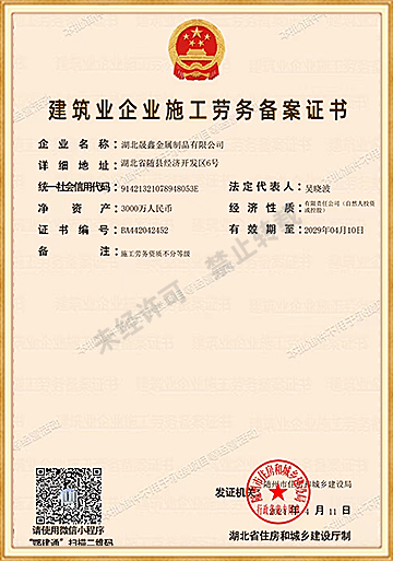 湖北晟鑫金属制品有限公司成立于2013年,我公司位于湖北省随州市随县经济开发区,注册资金3000万元,两个工业园厂区占地面积230亩,办公楼面积8千平米,厂房面积6万平米,年销售额3亿元以上。